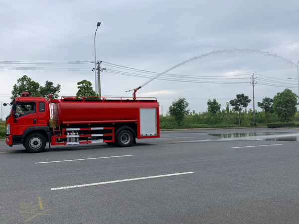 2)灑水車功能:該車安裝了前沖,后灑,后置工作平臺(tái),工作平臺(tái)安裝了灑水高炮,用作綠化灑水功能時(shí)運(yùn)行消防泵,關(guān)閉消防炮,打開前沖閥門,可沖洗路面,同時(shí)可后灑水部分可灑水隆塵,另工作平臺(tái)灑水高炮射程55米以上,可調(diào)成柱狀、霧狀和開花狀,可澆樹澆花等。
